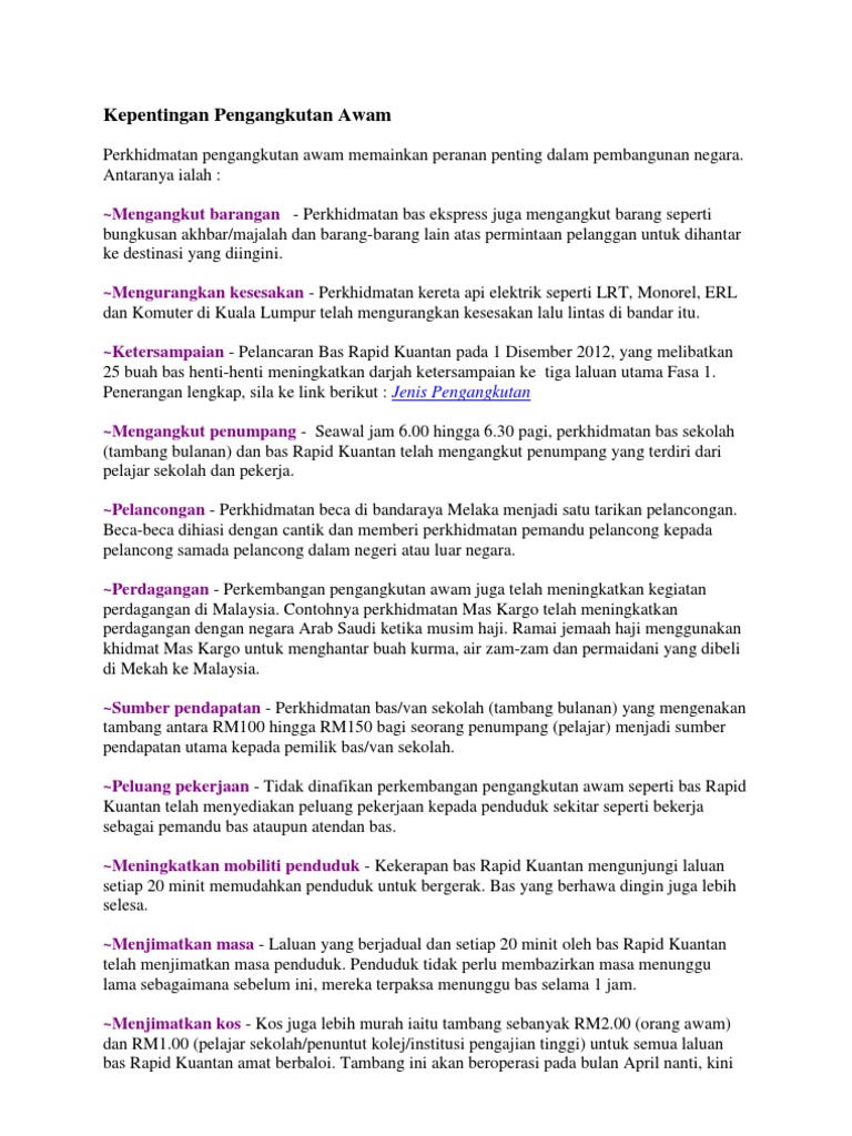Add to my workbooks 6 Download file pdf Embed in my website or blog. Dua perkara yang saling berkaitan dan mempunyai kepentingan tersendiri. Dalam mencapai status negara maju pada tahun 2020 pengangkutan awam seperti bas komuter teksi keretapi dan lain-lain sememangnya penting untuk menambah baik kualiti sistem pengangkutan serta kehidupan rakyat.