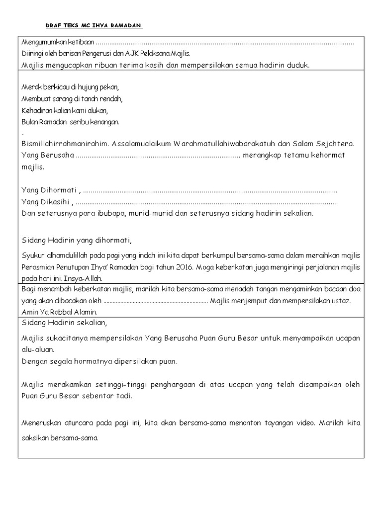 Teks pengacara majlis penutupan ihya ramadhan sumbangan anak yatim dan. Contoh Teks Ucapan Perasmi Program Ihya Ramadhan. TEKS PENGACARA MAJLIS PERASMIAN PROGRAM IHYA RAMADAN 2022 AININ SOFEA UCAPAN ALUAN MC Assalamualaikum WBT dan salam sejahtera saya ucapkan.